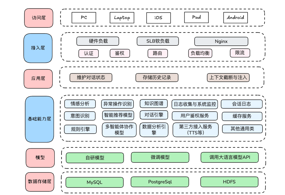 如上图所示。可拓展情感聊天系统的分层架构,自顶向下分为访问层(支持多终端访问)、接入层(通过硬件/软负载、Nginx等实现认证、鉴权、路由等等)、应用层(维护对话状态、存储历史记录等等)、基础能力层(提供情感分析、意图识别、知识图谱等核心能力与服务)、模型层(包含自研模型、微调模型以及大语言模型等API调用)、数据存储层(采用MySQL、PostgreSQL、HDFS等存储),各层协同保障系统的可拓展性和情感聊天功能的实现。