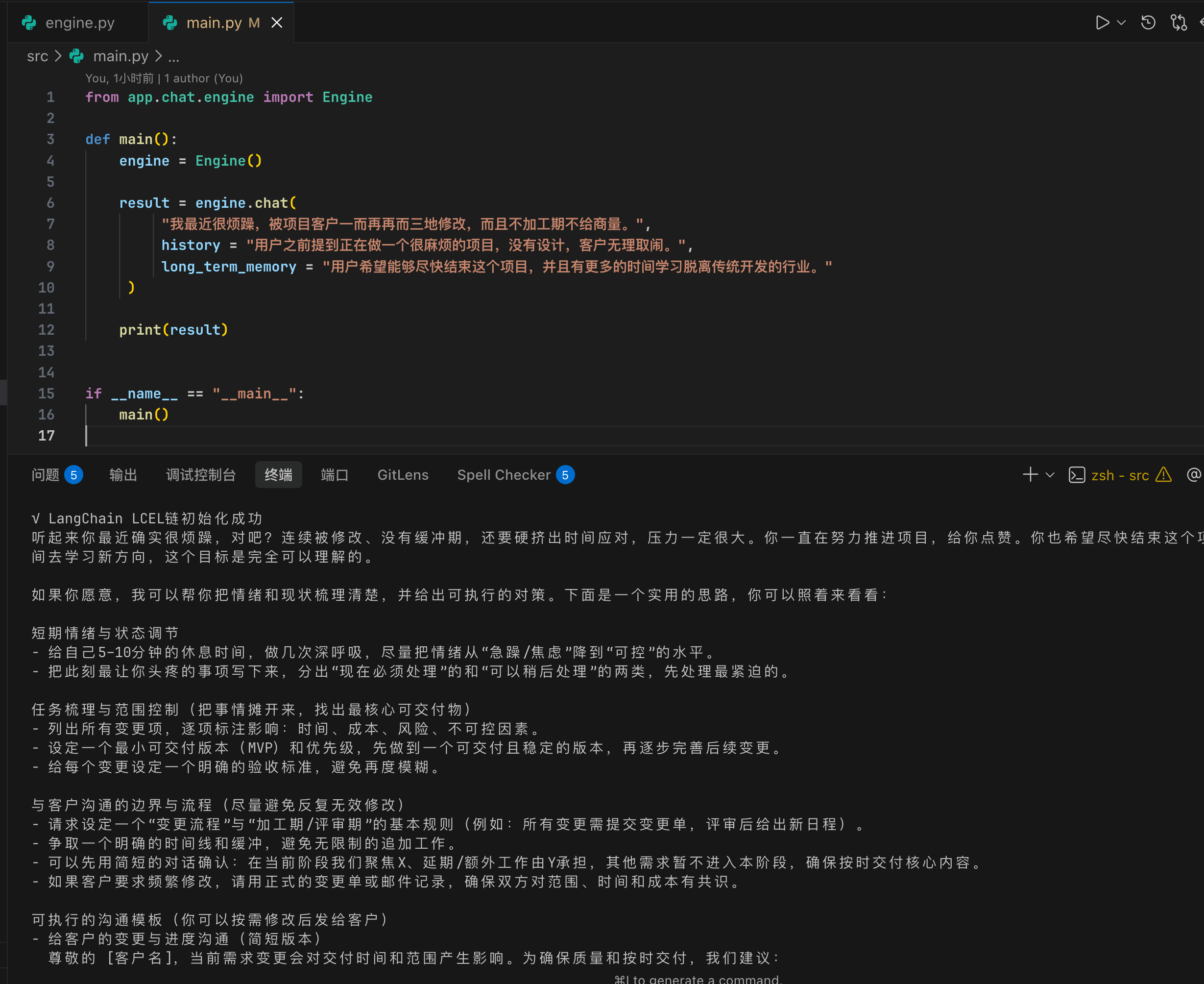 当调用chain.invoke(inputs)的时候,整个流程就会自动触发Python运行。假设输入为用户问题,inputs = {"user_input": "我最近老是失眠,怎么办"}。