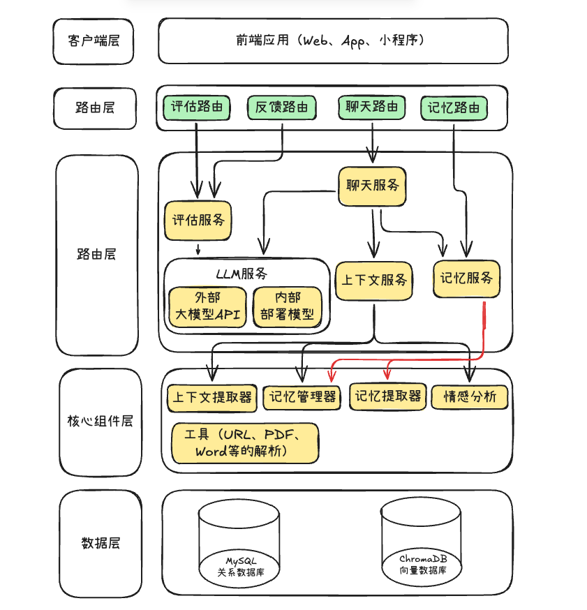 然后,这个聊天架构就会被分成客户端层、路由层、服务层、核心组件层、数据层、关联外部大模型API(Deepseek,Qwen,ChatGPT等 LLM服务);客户端层的前端应用通过路由层的评估、反馈、聊天、记忆路由,对接服务层的评估服务、聊天服务等等。聊天服务则依托上下文服务、记忆服务,结合核心组件层的上下文组装器、记忆管理器、记忆提取器、情绪分析器,和MySQL关系数据库,ChromaDB向量数据库进行交互,评估服务调用外部API,各层协同支撑聊天能力。