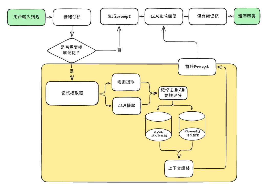 - 智能记忆提取:结合规则和LLM双重的策略,确保关键信息不遗漏