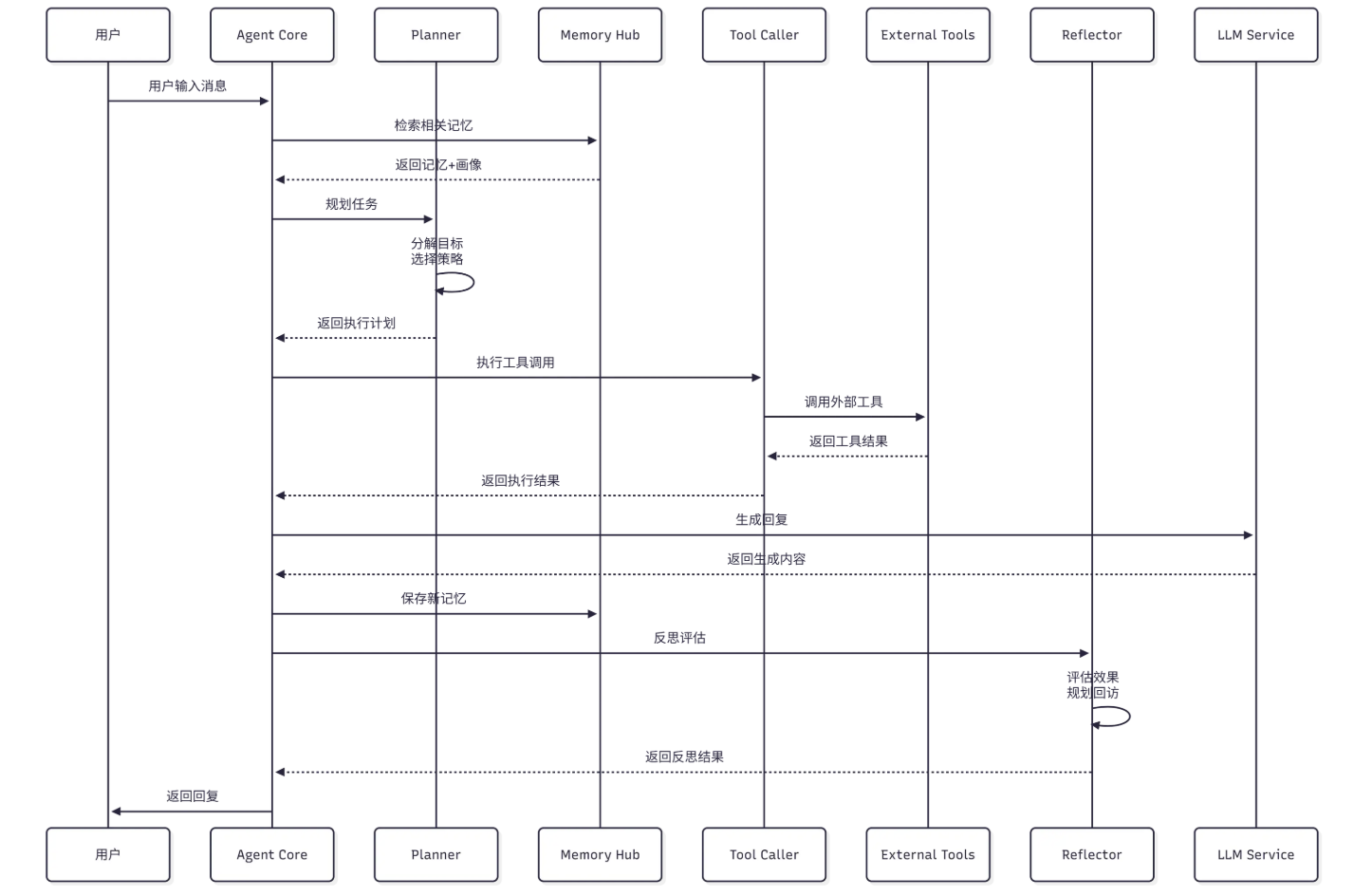 用户输入消息之后,Agent Core先向Memory Hub检索相关的记忆,结合返回的记忆画像,经过Planner分解目标、选策略生成执行计划;接着Tool Caller调用External Tools获取结果,结合LLM Service生成回复返回用户,同时将内容作为新记忆保存至Memory Hub;之后Reflector借助LLM Service反思,评估,规划回访然后返回结果,持续优化流程。